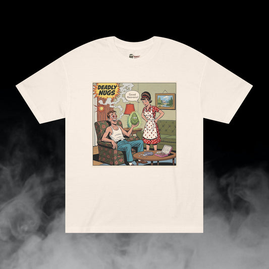 Good Heavens! / Suburban Husband and Wife Overwhelmed by Cannabis Experience Graphic Tee / Vintage Humor Comic Art Style / 420 Underground Stoner Culture / DEADLY NUGS