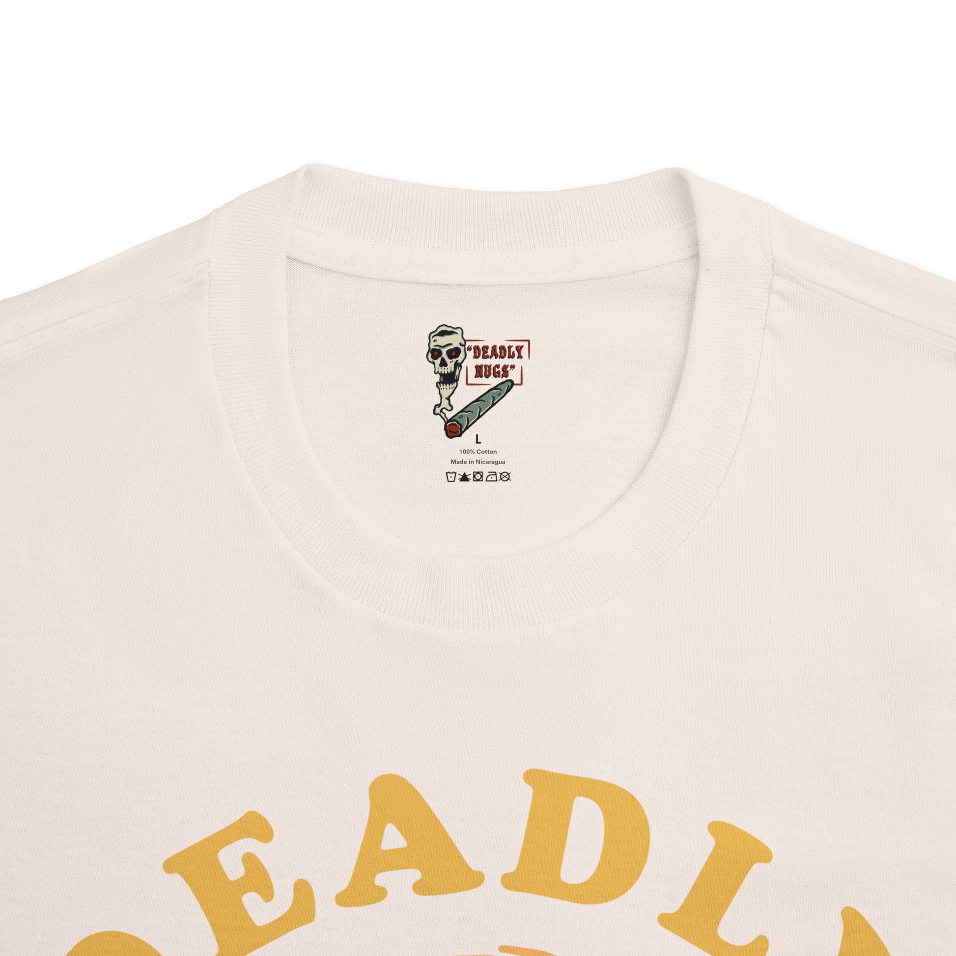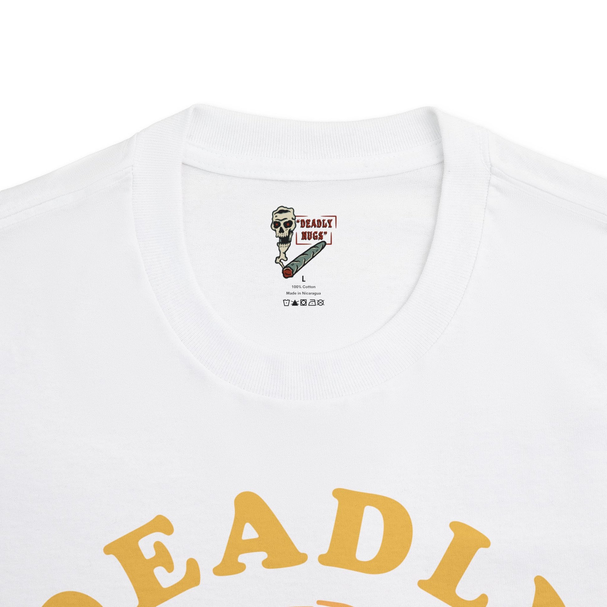 DEADLY NUGS original Flame in, Flame out T-Shirt with Yellow Print