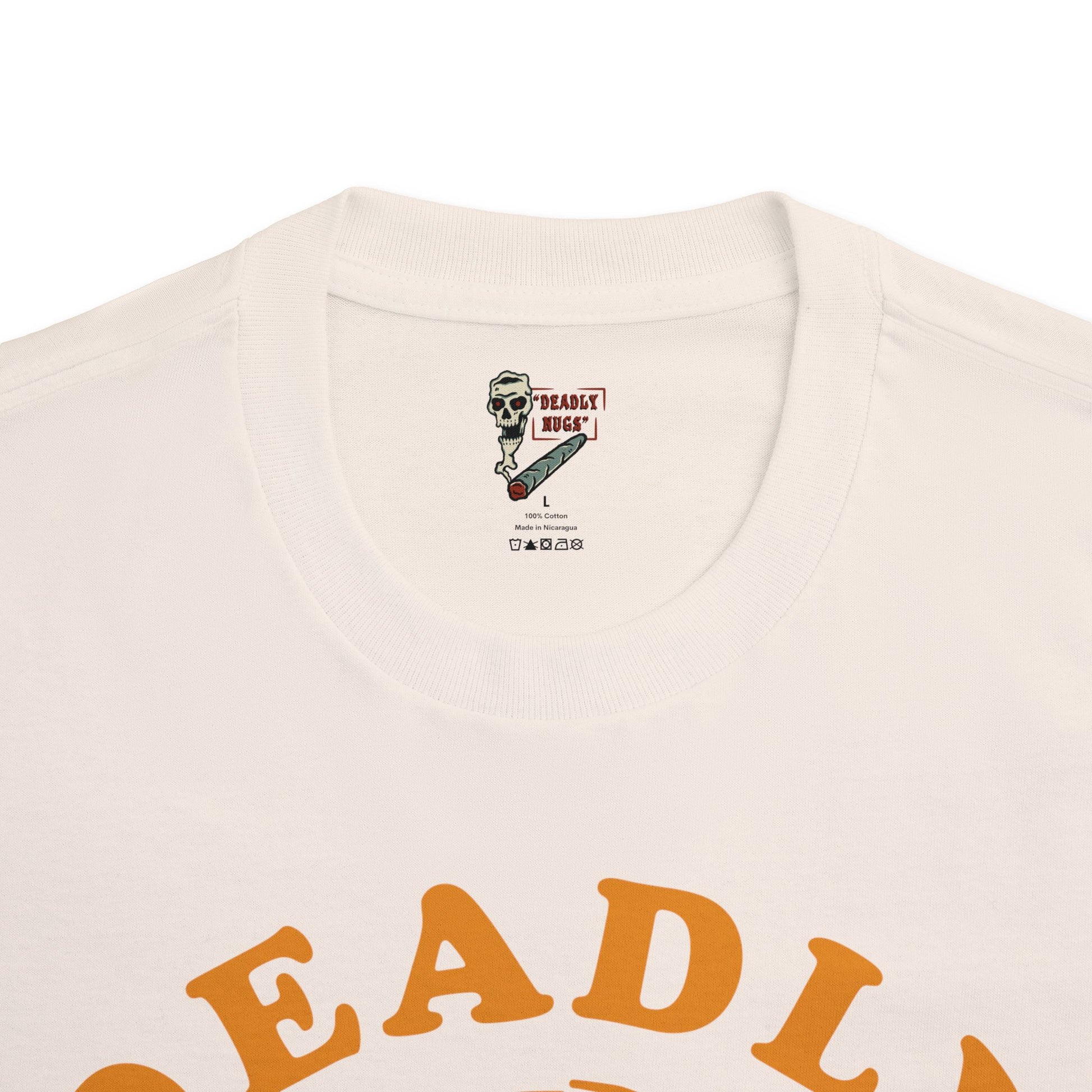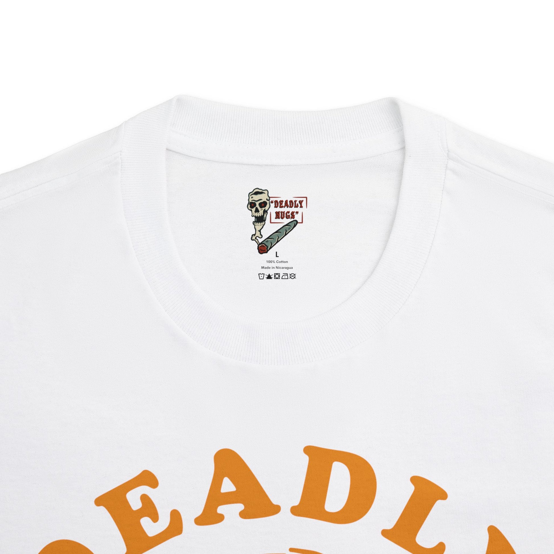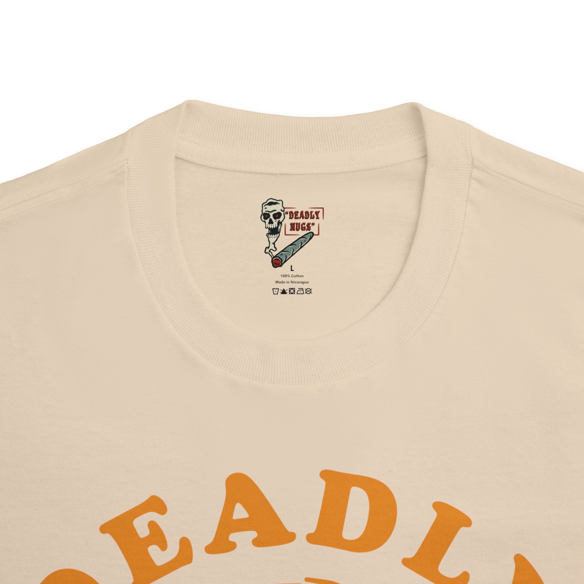 DEADLY NUGS original Flame in, Flame out T-Shirt with Orange Print