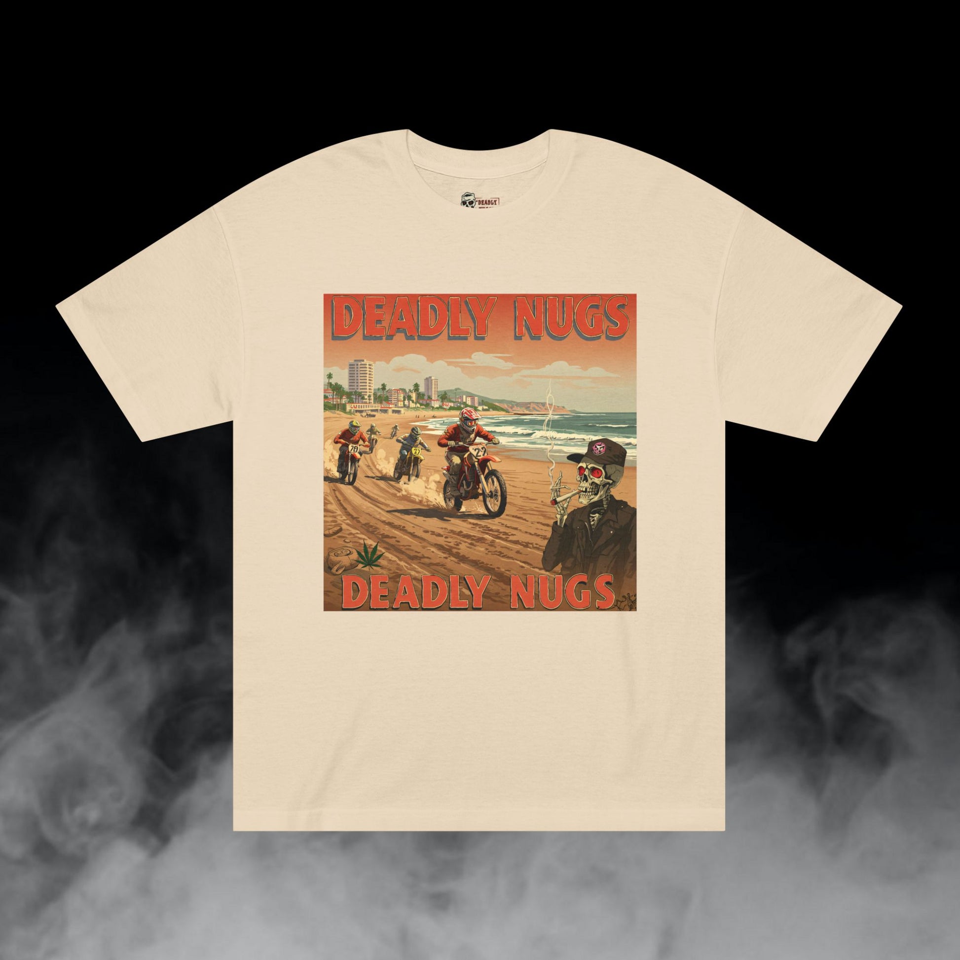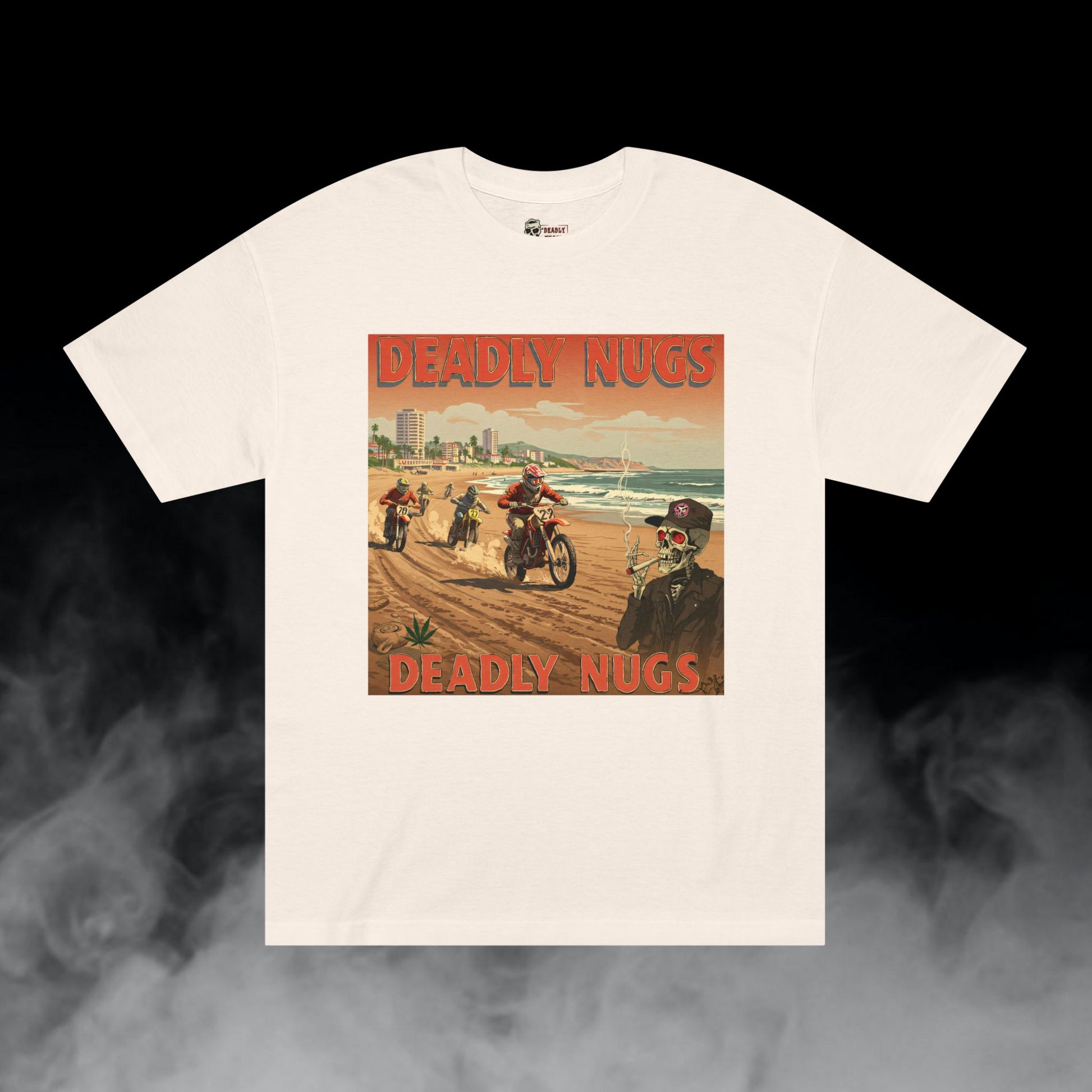 Moto Beach / Biker Dirt Bike Motorcycle Skeleton Graphic Tee / Gritty Vintage Travel Poster Art Style / 420 Underground Stoner Streetwear / DEADLY NUGS