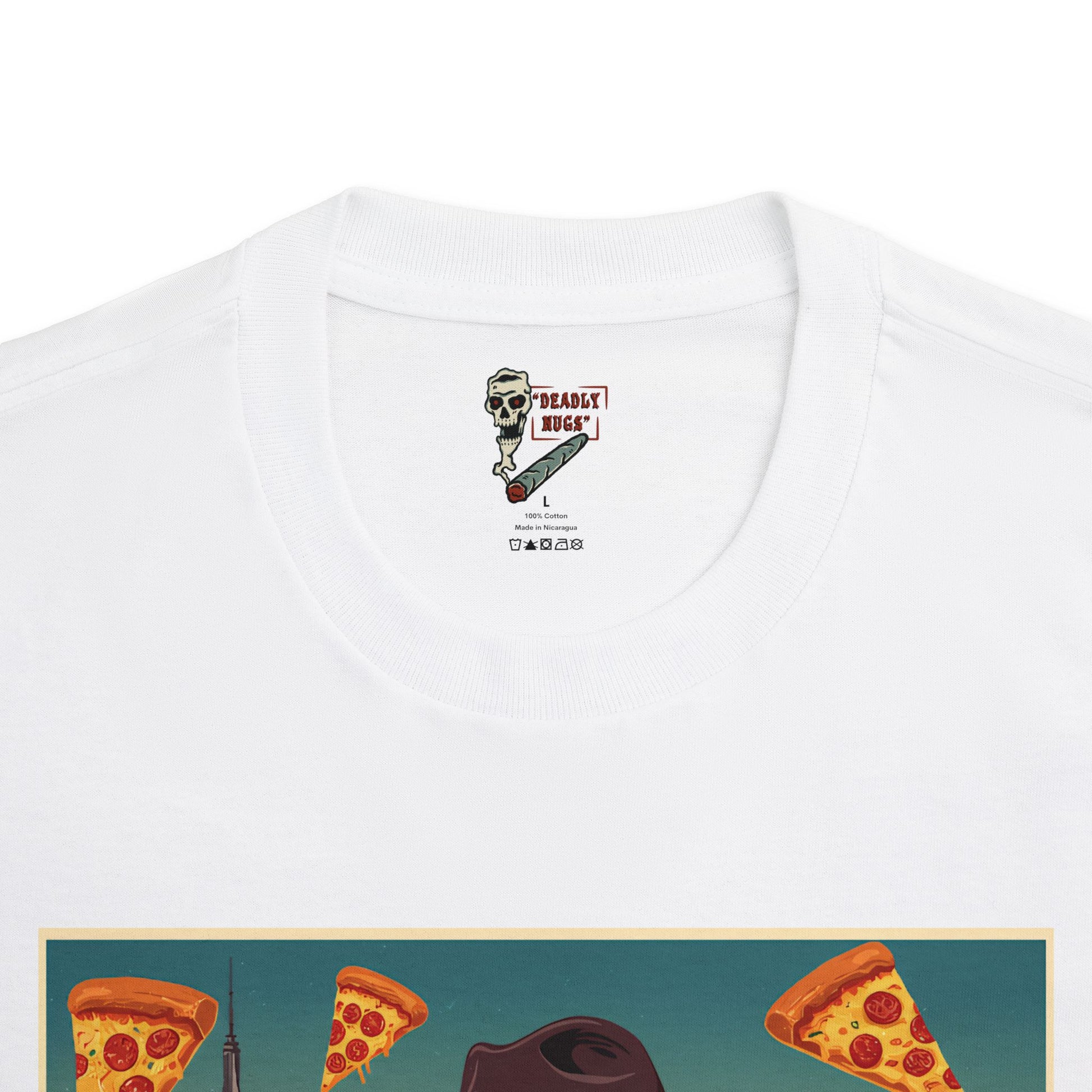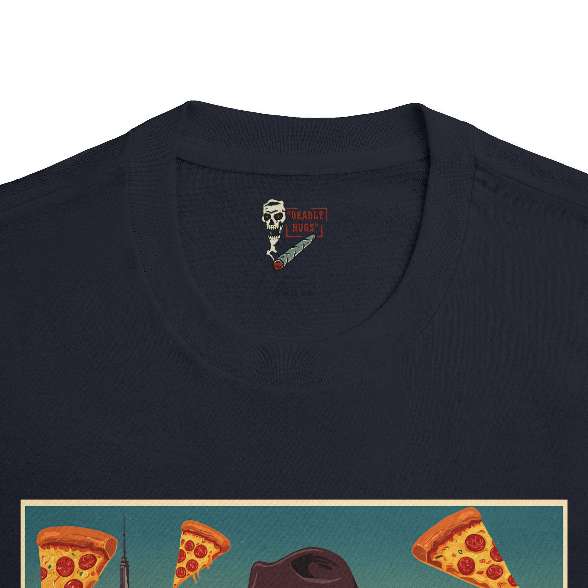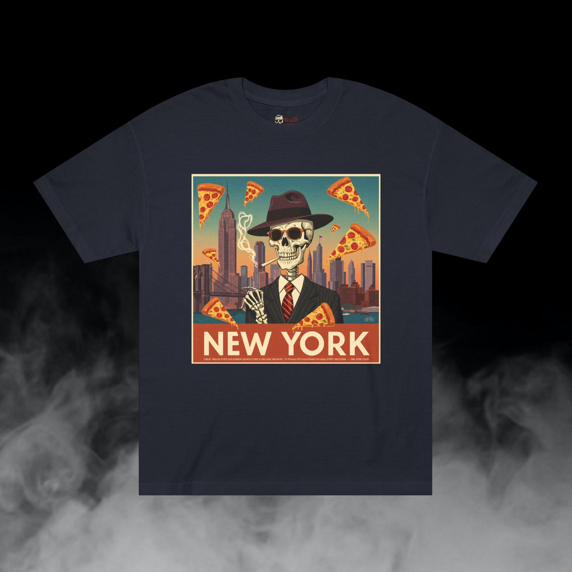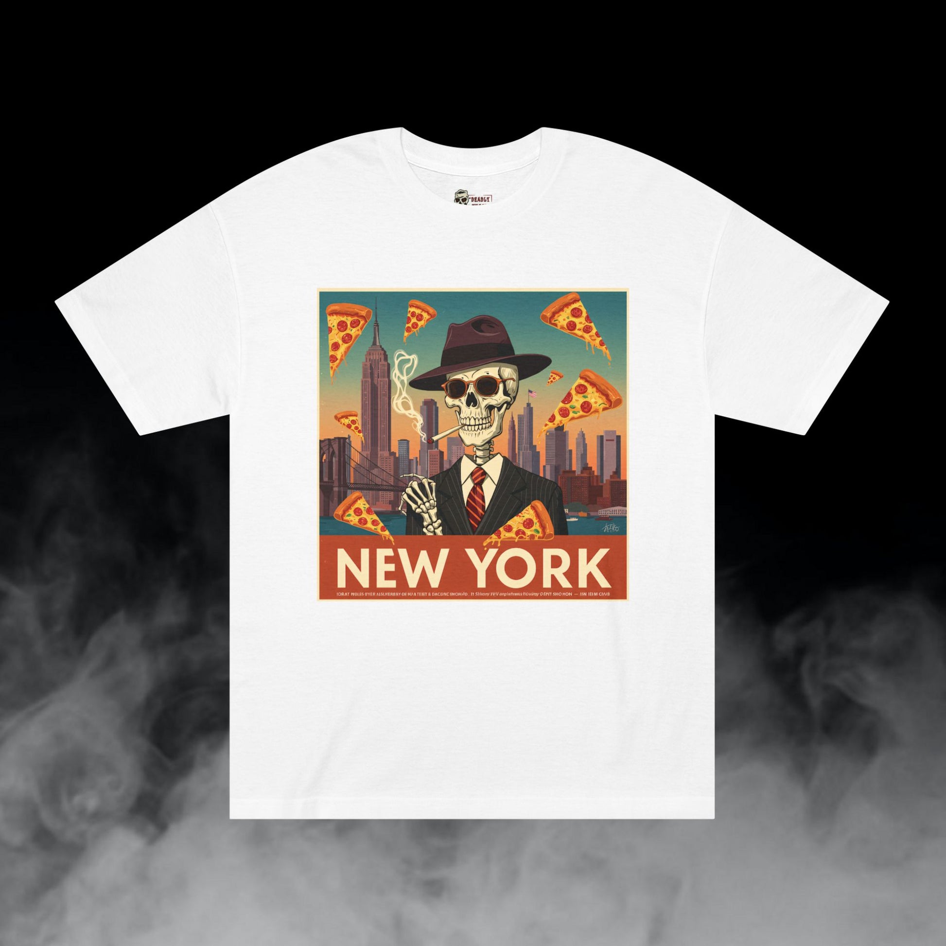 Pizza New York / City Skyline Skeleton Smoking Pizza Graphic Tee / Classic Vintage Travel Poster Art Style / 420 Underground Stoner Streetwear / DEADLY NUGS